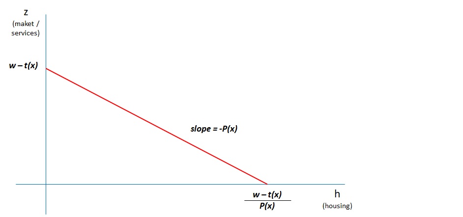 According to the graph, while the dwelling (on the abscissa axis) is closer to the origin, the people will have more access to (z); Likewise, they must pay for their homes at a price P (x) of (h) according to their location (in x), they receive a salary for their work and finally the transportation costs are t (x), that is, the transportation costs of living in x. With this, it can be established that the arrangement between the consumption of services (z) and housing (h) should be assumed by the salary after transportation costs, for a point (x), which is: