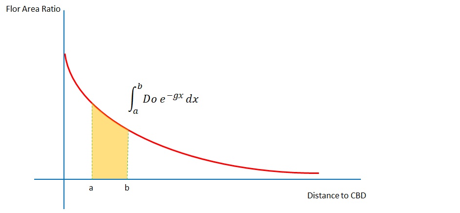The curve that expresses Density in a first analysis (but also shows Rent, Land Value and Floor area Ratio) is an exponential function of “e”, in the following terms: