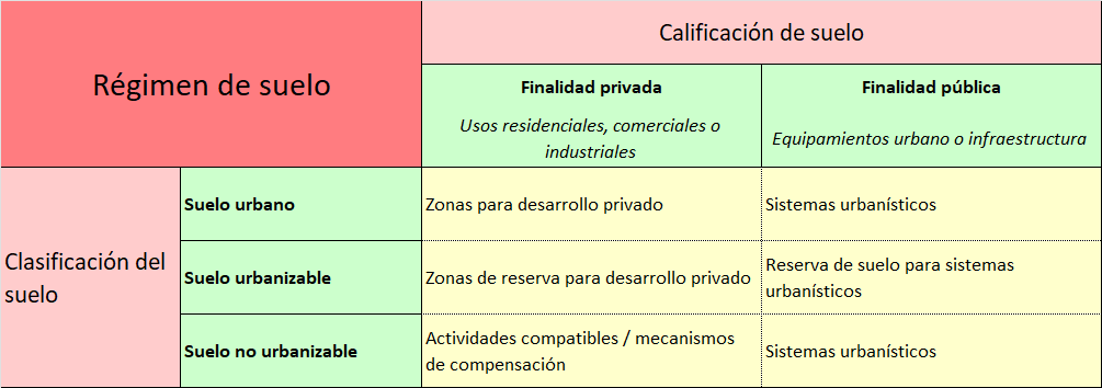 Es el componente del régimen de suelo que determina el destino del uso del suelo. Se establece tanto para el suelo urbano, como el suelo urbanizable y el suelo no urbanizable. Diferencia dos clases de suelo: los que tienen una finalidad pública y conforman Sistemas Urbanísticos (servicios urbanos), y los que tienen una finalidad privada y están destinados a usos o desarrollos privados.